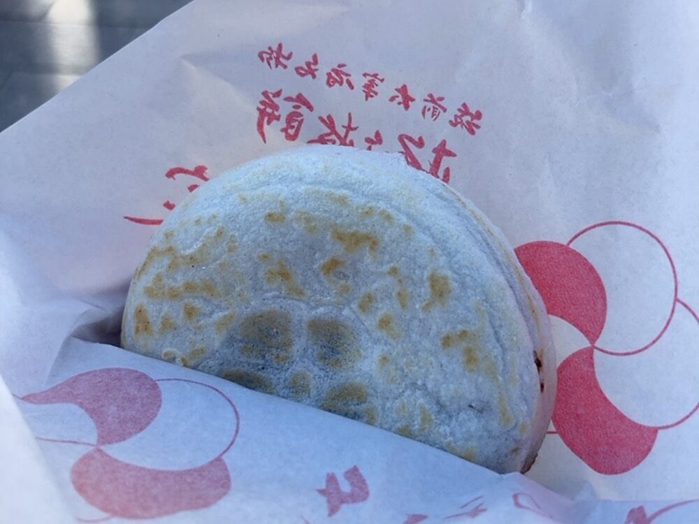 只要一個銅板就能品嘗到,價格相當親民。口味有熱和冷兩種可選。使用ふくや的微辣明太子搭配帶勁的山葵,份量剛好,走著走著很快就能吃完,是散步美食的完美選擇。