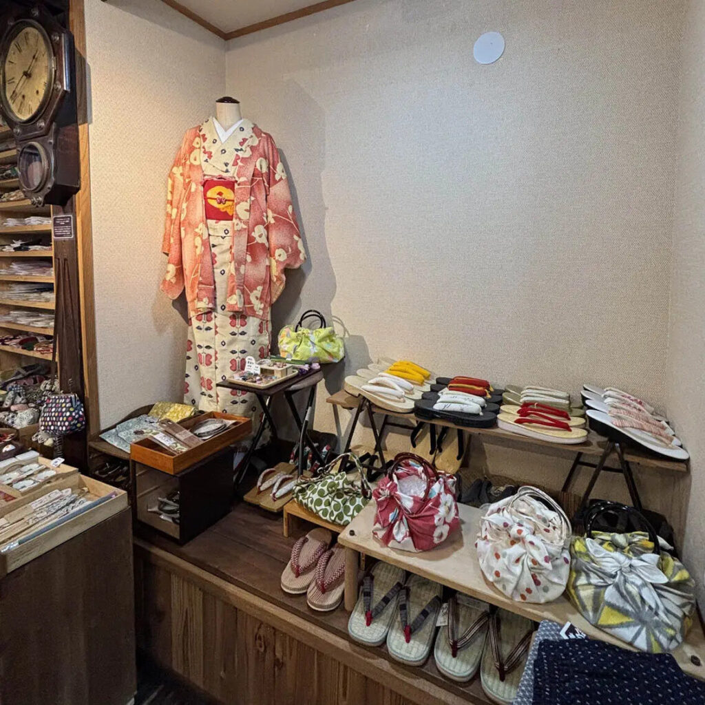 這家是併設在 1854 年(安政元年)創業的老字號吳服店「きもの処 久賀屋」裡,把和服文化與咖啡空間融合在同一處。踏進店內就能看到和服、和風小物與雜貨整齊陳列,從創業時期一路傳承下來的古董時鐘與家具也把空間妝點得很有味道,氛圍像從江戶時代穿越過來一樣。坐在沉靜的和風空間裡,節奏會自然慢下來,很適合用來好好過一段舒服的咖啡時間。