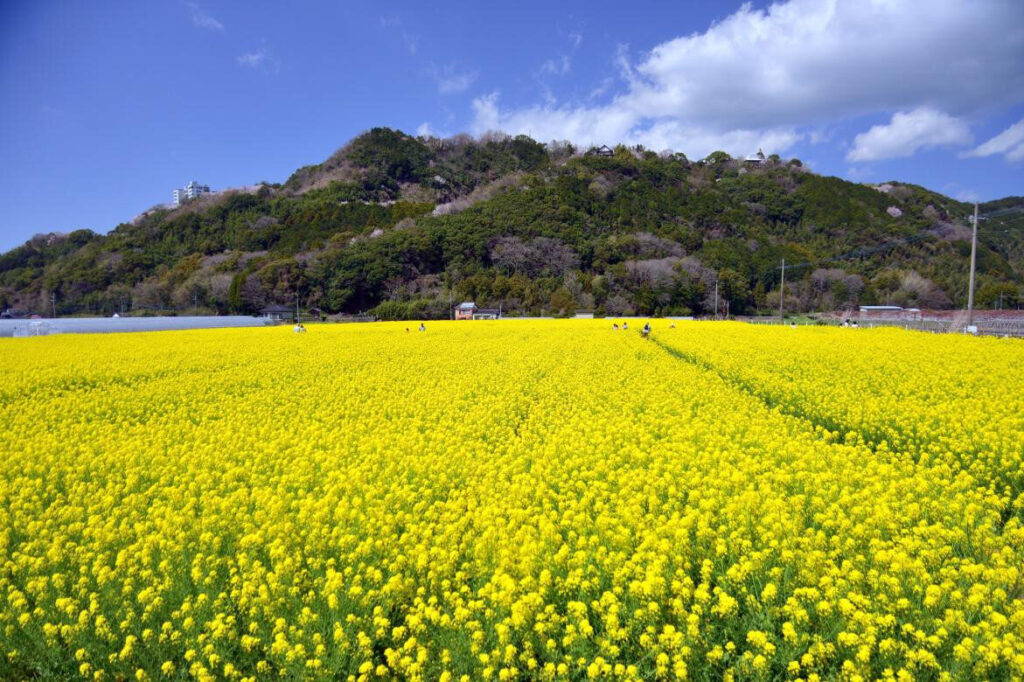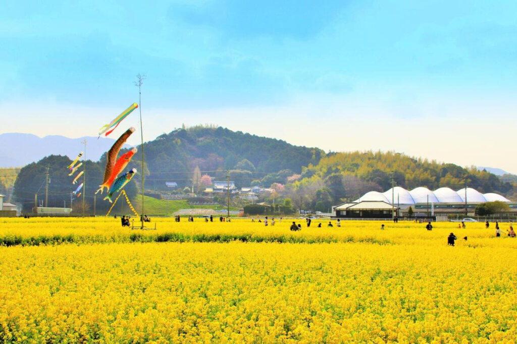 如同一整片黃色地毯鋪展開來,在約6公頃的土地上盛開著約500萬株油菜花,景象相當壯觀。搭配鯉魚旗與黃色手帕的裝置,也營造出層次豐富的畫面。例年的最佳觀賞期為3月初至下旬。2026年3月15日將舉辦「油菜花祭」,現場氣氛熱絡,人潮聚集。