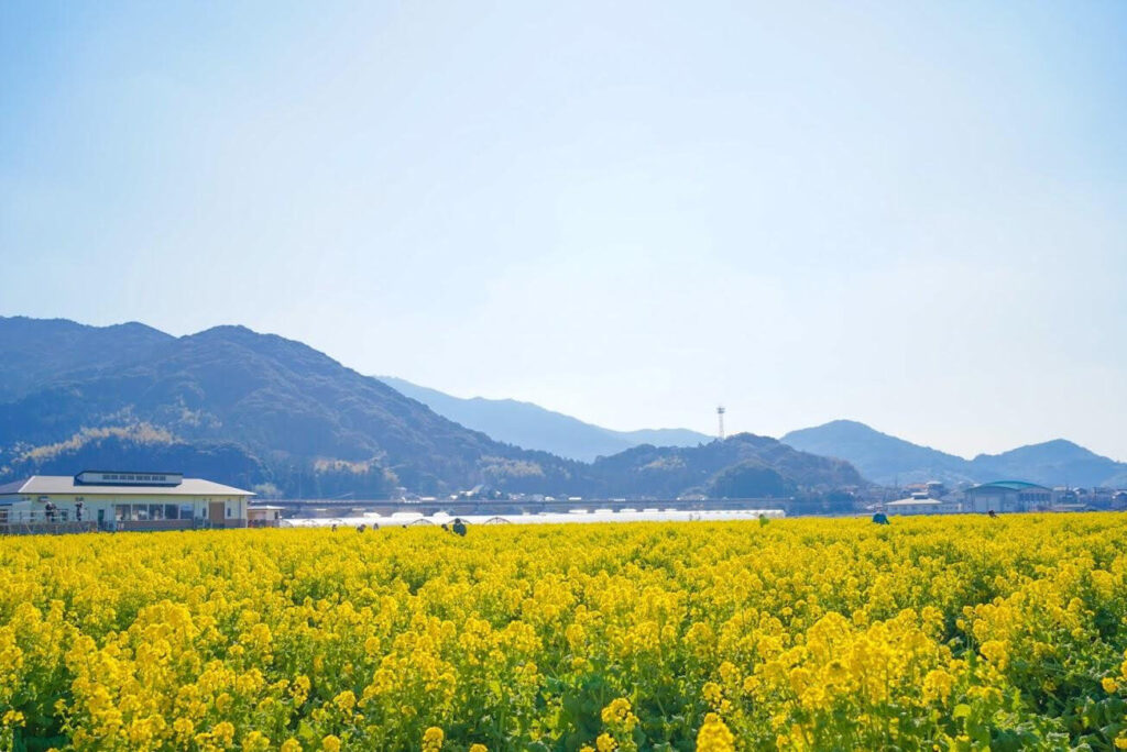 在約1.6公頃的廣闊花田中,約80萬株油菜花盛開鋪展。例年的最佳觀賞期為3月初至下旬。2月中旬到3月初也會舉辦付費採摘體驗,在油菜花環繞的環境中度過的時光,會自然留下清晰的記憶。這裡附近還有原鶴溫泉哦!