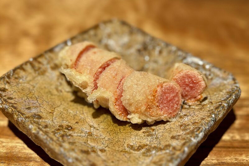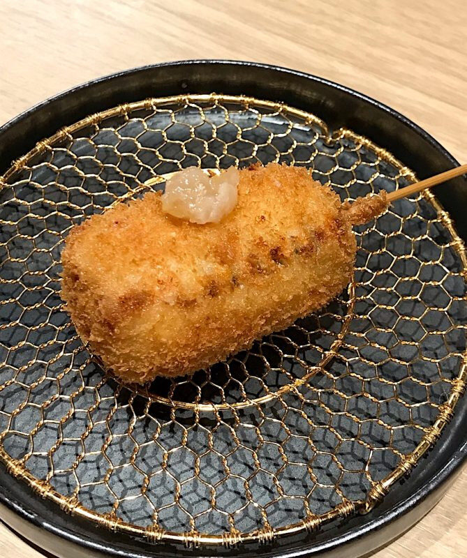 這裡主打的是「創作系串揚」。像是油封、波隆那火腿、莫札瑞拉起司等偏洋風的關鍵字特別吸睛,讓人忍不住好奇會變化成什麼樣的串炸。正準備好好見識一番時,第一道就直接來個重擊——灑滿帕瑪森起司、熱騰騰的「松露風味卡波那拉串」。用筷子輕輕一劃,自製培根與濃郁起司醬瞬間流瀉而出,再加上松露油的香氣,眼前彷彿出現一道高級義式單點料理。這突如其來的美味,真的讓人瞬間被收服,對下一串的期待值直線上升。