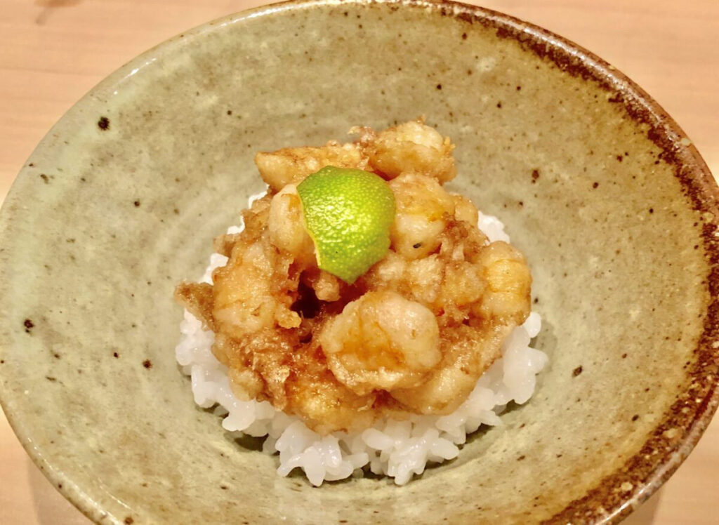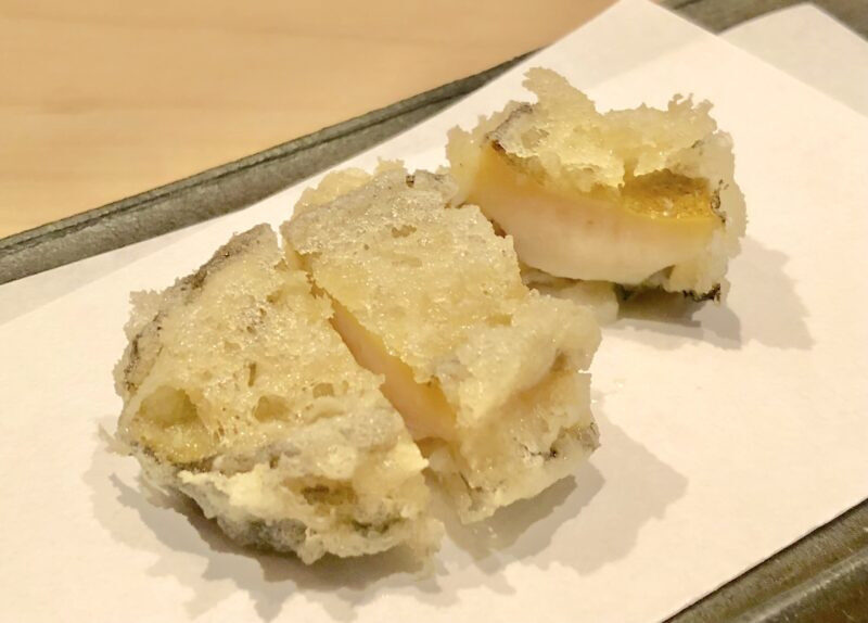 料理僅提供每位16,500日圓的主廚精選套餐,內容包含刺身、前菜、約10道天婦羅,以及飯食與水果作為收尾。使用太白胡麻油與沙拉油調和而成的炸油,會透過傾斜油鍋來改變油的深度,藉此細膩調整溫度——正如內田先生所說:「利用較淺與較深的位置來控制油溫。」天婦羅的種類多樣:鮑魚,蘆筍,各種新鮮食材輪番上陣,充滿了各種口感與油炸間的驚喜化學反應。喜歡吃天婦羅的可以來試試看哦!
