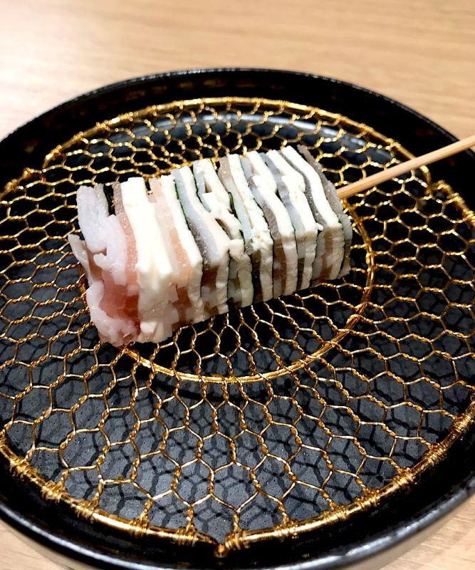 接著登場的是「豬肉千層串(藻鹽檸檬)」,將起司、大葉與五花肉層層堆疊,風味奢華又平衡。麵衣口感細緻溫柔,原來使用的是東京名店也愛用的「中屋パン粉工場」高級麵包粉。再加上以米油清爽炸製,不僅外酥內嫩,吃起來也毫無負擔。這種輕盈卻充滿創意的表現,正是「檸檬」最迷人的地方。