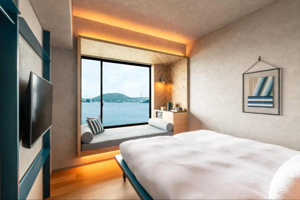 「BEB5 門司港 by 星野集團」的客房全數為海峽景觀房型。共 119 間客房皆可一覽眼前展開的關門海峽與下關一帶景色,包含可入住 3 人的「海峽雙床房」,以及最多可容納 4 人、宛如秘密基地般的「高台房(Yagura Room)」等,皆為充滿玩心的設計房型。房內設有大片窗景與配置日間床的「放鬆寢台」,能一邊眺望海面上緩緩航行的船隻,一邊悠閒休憩,享受極致療癒的時光。