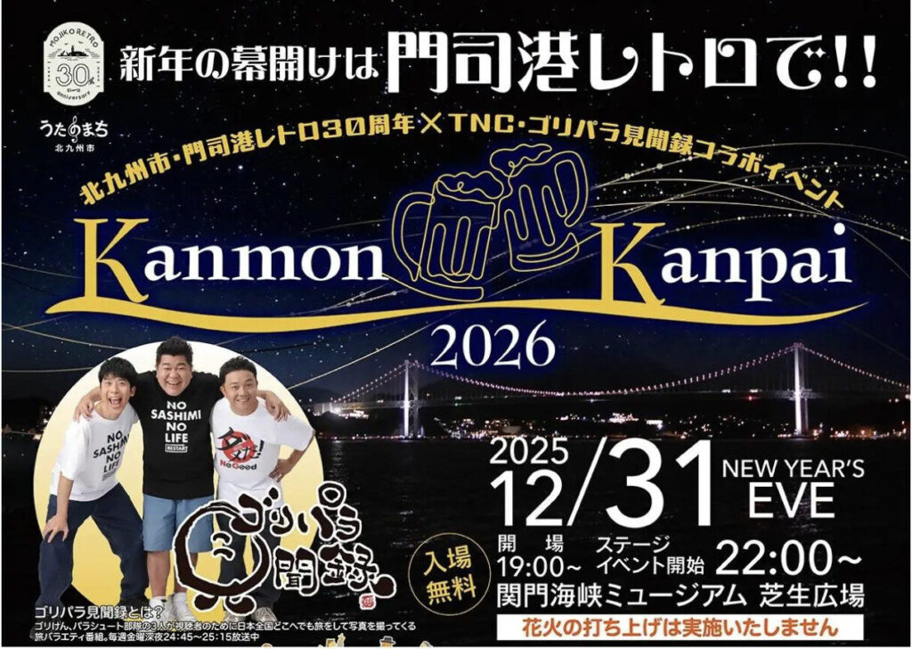 22:00,特別舞台活動「よしもと KANMON KANPAI 卡拉 OK」正式開場,由福岡吉本所屬的凱金翔擔任主持,並邀請こがけん、トータルテンボス等藝人輪番上陣,現場氣氛勢必嗨到最高點。隨著倒數時刻逼近,23:45 起將展開與福岡人氣深夜節目 TNC《ゴリパラ見聞錄》的合作舞台;元旦 0:45,該節目的公開現場直播也將正式播出。能與「ゴリパラ」三人組一同迎接 2026 年,無論是否是節目粉絲,都非常值得在除夕夜到門司港來一場熱鬧的乾杯與倒數。
