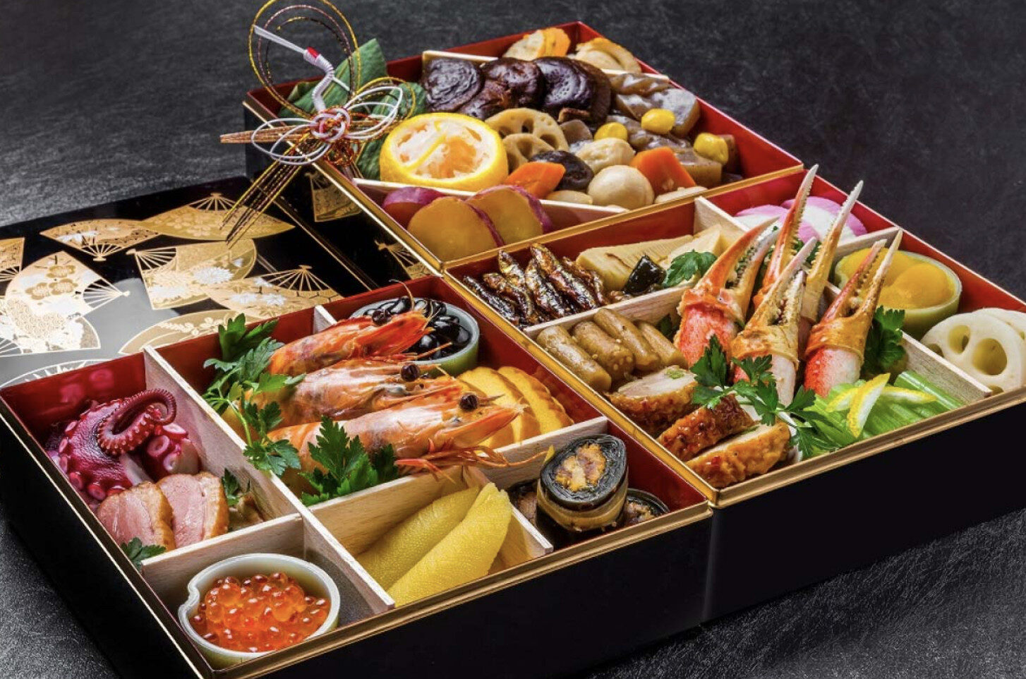 從適合5~6人的三段重、3~4人的二段重,到2~3人的一段重,能依照家庭人數與使用情境靈活選擇。日式御節中,數子、黑豆、鮑魚、龍蝦等高級食材華麗呈現,也有融入西式與中式元素的款式,風味層次更加多元。