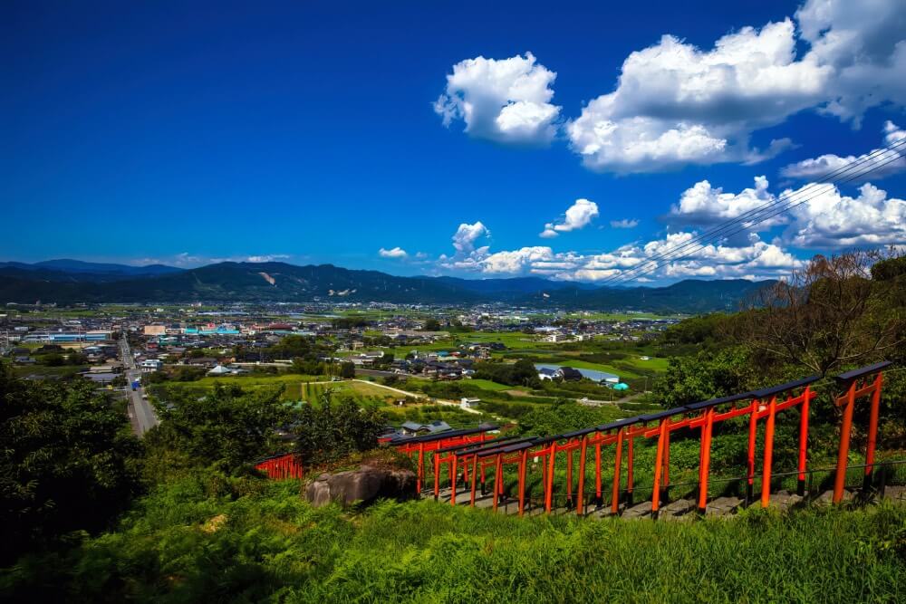 沿著山勢綿延的紅色鳥居,映入眼簾的是一片開闊壯麗的景致。千鳥居與自然風光交織而成的獨特景象,讓這裡成為日本社群上的人氣打卡景點!
