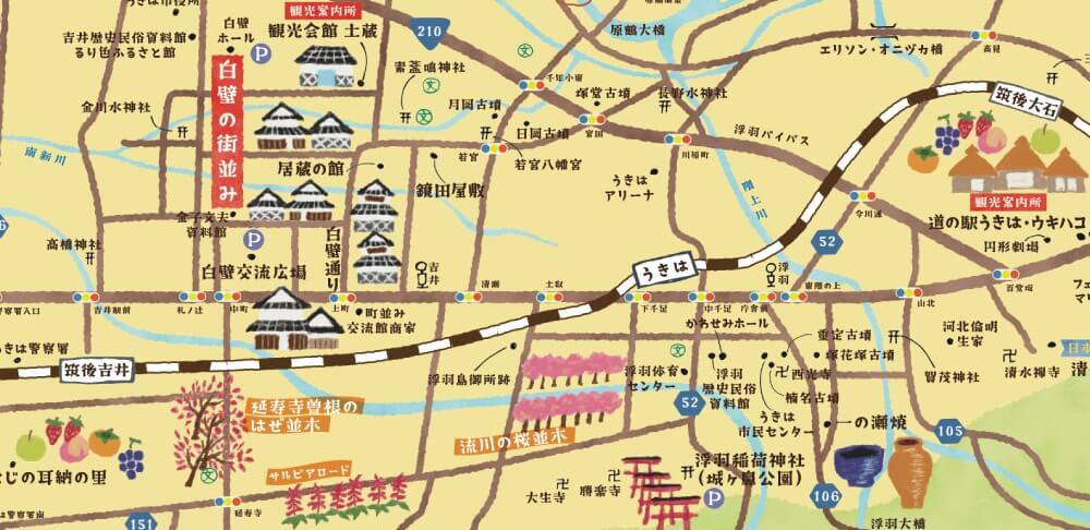 此外,浮羽擁有多樣的自然景觀:像是沿流川延伸約 2 公里的櫻花樹,以及入選「日本百大梯田」的葛籠梯田。