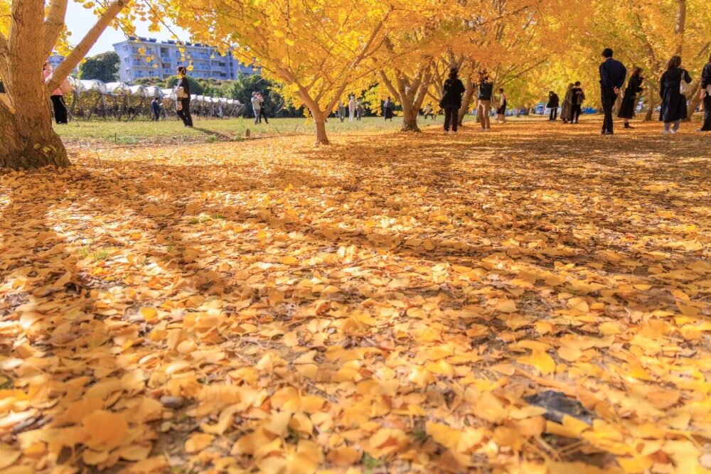 秋天除了紅葉外,金黃色的銀杏也絕對值得一看!當銀杏葉紛紛落下時,地面就像鋪上一層金色地毯,閃耀又夢幻,真的非常美麗,推薦給大家囉!