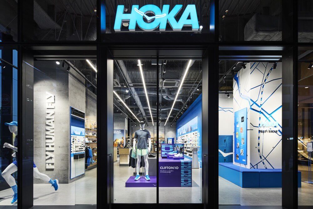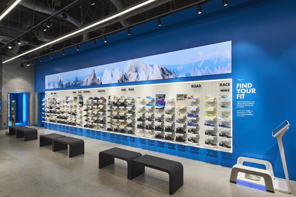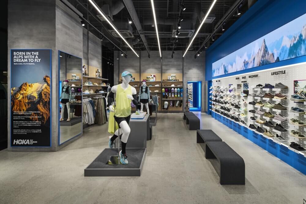 店內以 HOKA 的科技感與創新形象打造,陳列最新鞋款、人氣跑鞋、服飾與配件等,商品種類齊全。HOKA RUN CLUB社群空間則以 HOKA 藍與白色為主色調,並融入福岡天神地區地圖,是店內的特色區域,訪客可以在此試跑最新 HOKA 鞋款。
