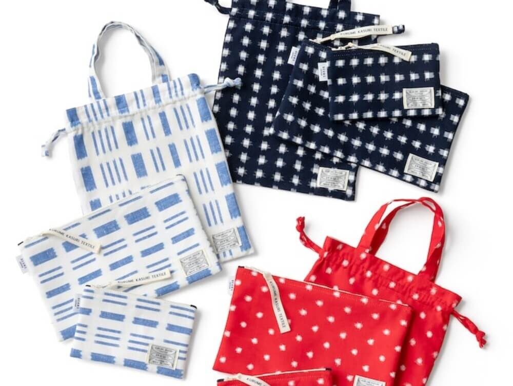 使用擁有220年以上歷史的久留米絣布料製作的束口托特包與各式收納袋中,大尺寸款式更特別設計成能收納御朱印帳的大小。
