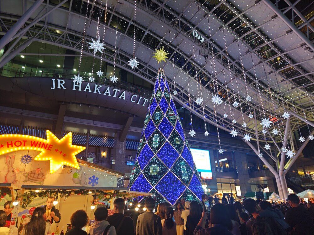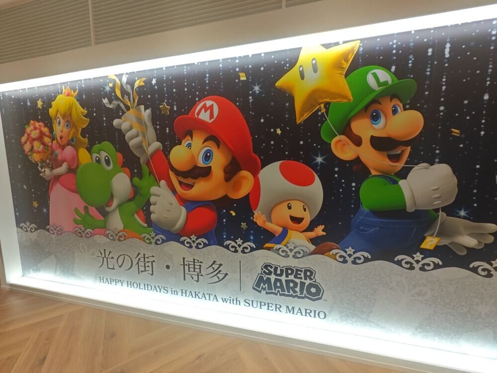 JR博多城目前正舉辦光之街・博多活動,只要在店內使用任天堂帳號完成 Check-in,就能獲得原創貼紙一張。今年博多站前的聖誕樹也悄悄換上瑪利歐主題裝飾。加上這次瑪利歐與 JR 九州的聯名企劃,走在九州許多車站,都能發現瑪利歐的身影喔!