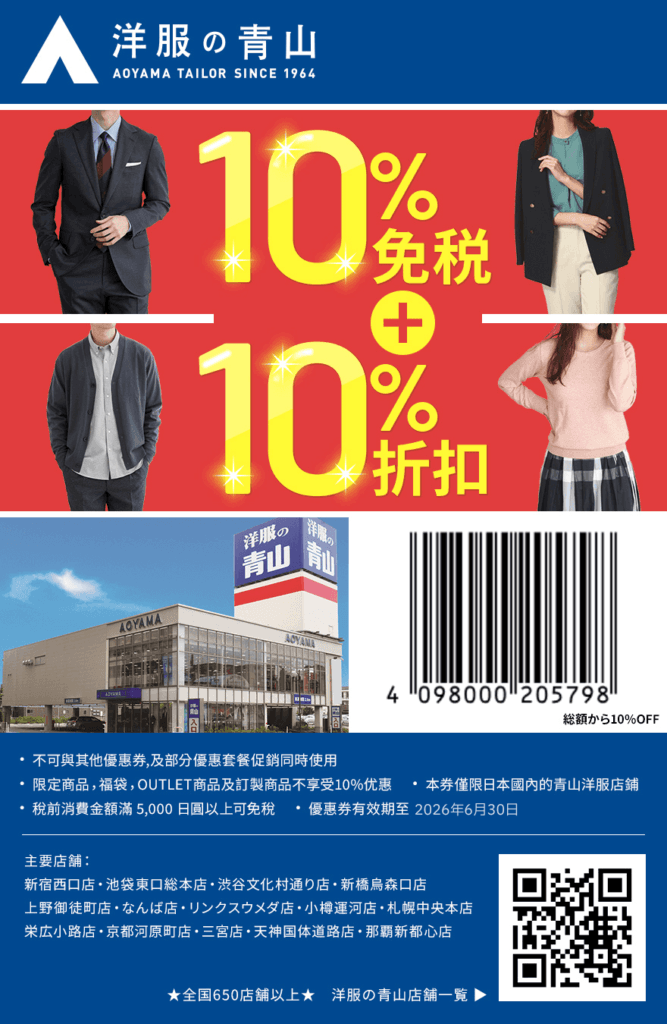 優惠券 洋服的青山優惠券!免稅+最大10%OFF by Nina 2025 年 5 月 20 日 written by Nina 2025 年 5 月 20 日 200 青山商事自創業以來,始終秉持「提供更好的商品、更實惠的價格,透過服飾銷售來貢獻社會」的經營理念,以男士服飾為中心,積極拓展事業領域,邁向全方位的零售與服務事業。 0 FacebookWhatsappLINEEmail Nina 台灣出身, 2017年來到日本,2019年搬到福岡後就一直住下來了! 非常喜歡福岡,希望可以分享更多相關資訊給大家~ previous post 唐吉軻德優惠券!免稅+最大7%OFF next post JUNGLE優惠券!免稅+最大5%OFF You may also like Snow Peak優惠券!免稅+最大7%OFF,消費10,000円~29,999円贈送精美贈品 愛電王優惠券!免稅+最大7%OFF BRIEFING優惠券!最大10%OFF JUNGLE優惠券!免稅+最大5%OFF 唐吉軻德優惠券!免稅+最大7%OFF 大賀藥局優惠券!每滿10,000円即減500円 鶴羽藥妝優惠券!免稅+最大7%OFF Sundrug(尚都樂客)優惠券!免稅+最大7%OFF Bic Camera優惠券!免稅+最大7%OFF Cocokara Fine優惠券!免稅+最大7%OFF