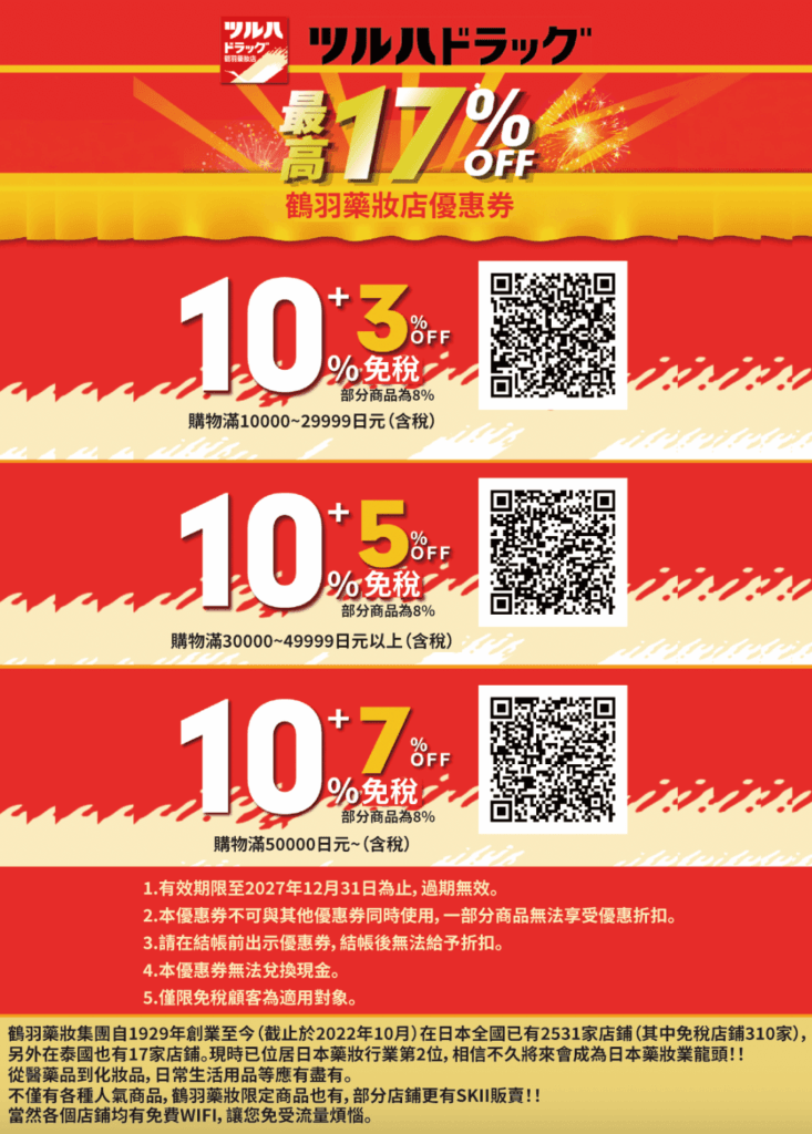 優惠券 鶴羽藥妝優惠券!免稅+最大7%OFF by Nina 2025 年 5 月 20 日 written by Nina 2025 年 5 月 20 日 198 TSURUHA是一家將近百年的老牌子集團,裡面的藥品種類齊全,並也有開發自家品牌「くらしリズム」。許多家TSURUHA也多配置藥劑師可以詢問,購買第一類醫藥品喔。 0 FacebookWhatsappLINEEmail Nina 台灣出身, 2017年來到日本,2019年搬到福岡後就一直住下來了! 非常喜歡福岡,希望可以分享更多相關資訊給大家~ previous post Sundrug(尚都樂客)優惠券!免稅+最大7%OFF next post 大賀藥局優惠券!每滿10,000円即減500円 You may also like Snow Peak優惠券!免稅+最大7%OFF,消費10,000円~29,999円贈送精美贈品 愛電王優惠券!免稅+最大7%OFF BRIEFING優惠券!最大10%OFF JUNGLE優惠券!免稅+最大5%OFF 洋服的青山優惠券!免稅+最大10%OFF 唐吉軻德優惠券!免稅+最大7%OFF 大賀藥局優惠券!每滿10,000円即減500円 Sundrug(尚都樂客)優惠券!免稅+最大7%OFF Bic Camera優惠券!免稅+最大7%OFF Cocokara Fine優惠券!免稅+最大7%OFF