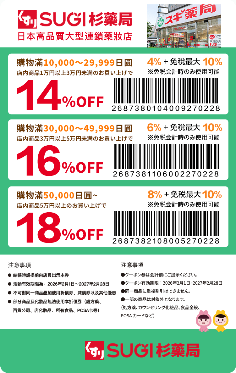優惠券 SUGI杉藥局優惠券!免稅+最大8%OFF by Nina 2026 年 3 月 2 日 written by Nina 2026 年 3 月 2 日 869 SUGI杉藥局(Sugi Drug)是日本知名連鎖藥妝店,以「家庭藥局」定位深入社區,全日擁有超過2,200間門市,主打藥品、美妝、日用品及自有品牌「S-SELECT」。福岡在博多站附近也有門市喔! 優惠券 0 FacebookWhatsappLINEEmail Nina 台灣出身, 2017年來到日本,2019年搬到福岡後就一直住下來了! 非常喜歡福岡,希望可以分享更多相關資訊給大家~ previous post City Pop | 感受昭和風情福岡 | 體驗日本輝煌年代 next post 福岡抹茶7選 | 抹茶星人必吃 | 福岡café甜品特輯 You may also like COSMOS科摩思優惠券!免稅+最大9%OFF YAMADA山田電機優惠券!免稅+最大7%OFF Snow Peak優惠券!免稅+最大7%OFF,消費10,000円~29,999円贈送精美贈品 愛電王優惠券!免稅+最大7%OFF BRIEFING優惠券!最大10%OFF JUNGLE優惠券!免稅+最大5%OFF 洋服的青山優惠券!免稅+最大10%OFF 唐吉軻德優惠券!免稅+最大7%OFF 鶴羽藥妝優惠券!免稅+最大7%OFF Sundrug(尚都樂客)優惠券!免稅+最大7%OFF