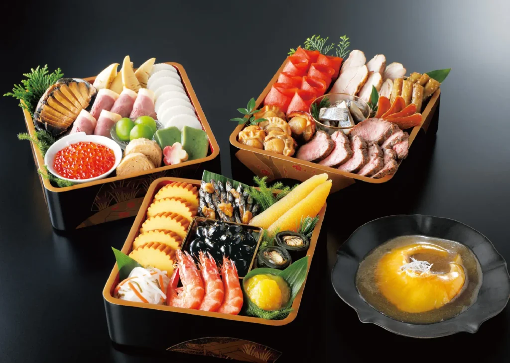 御節料理通常由多種具有象徵意義的食材組成,並精美地擺放在稱為「重箱」的漆器盒中。以下是一些典型的御節料理: