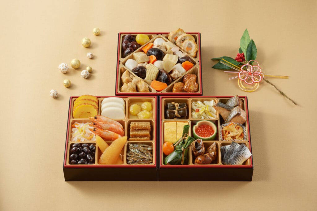 御節料理通常由多種具有象徵意義的食材組成,並精美地擺放在稱為「重箱」的漆器盒中。以下是一些典型的御節料理: