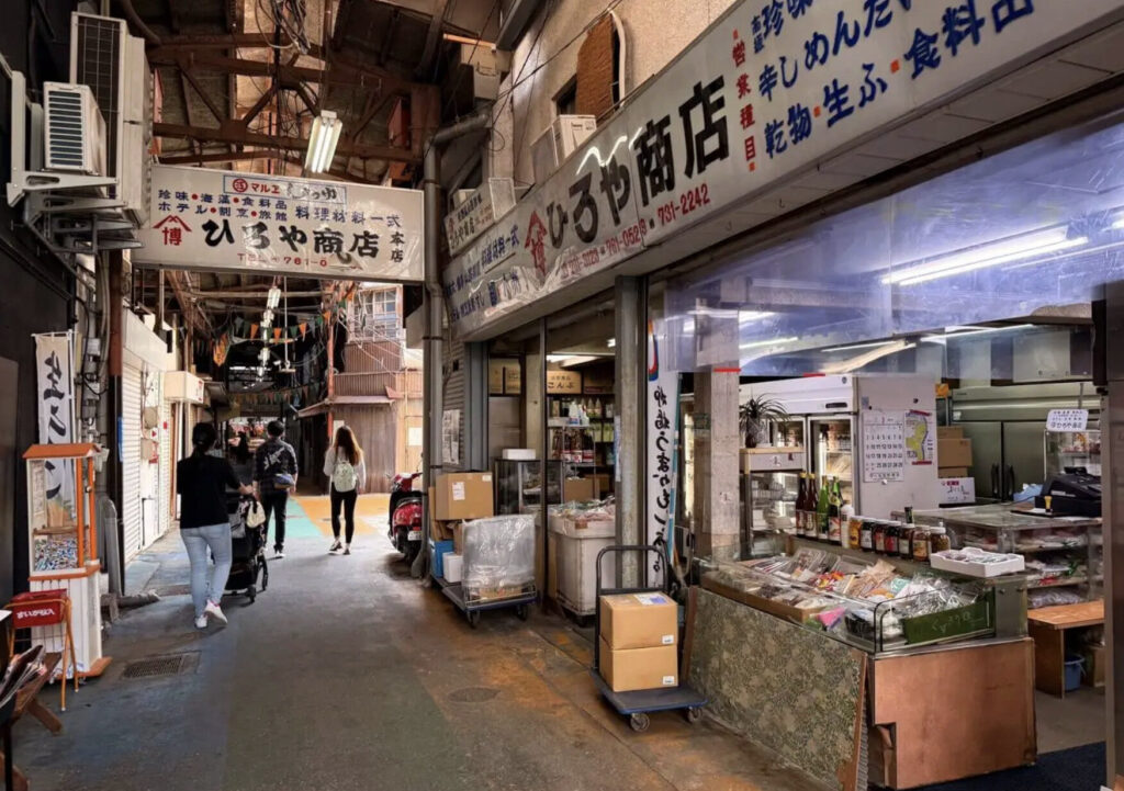 玄界灘現撈般鮮活的海魚、辛子明太子等博多滋味一字排開,連專業料理人也會來採買備料的市場。以鮮魚店為中心的店鋪沿著約 1 公尺寬的小巷緊密相連,走進去就像被食材的氣味與人聲包圍。除了青果店與和菓子店,還有販售昆布、鹽乾物、漬物等店家,品項相當齊全;冬季更會因天然河豚、鮟鱇魚與あら等旬味而聚集大量前來尋貨的客人,成為名符其實的「博多廚房」。