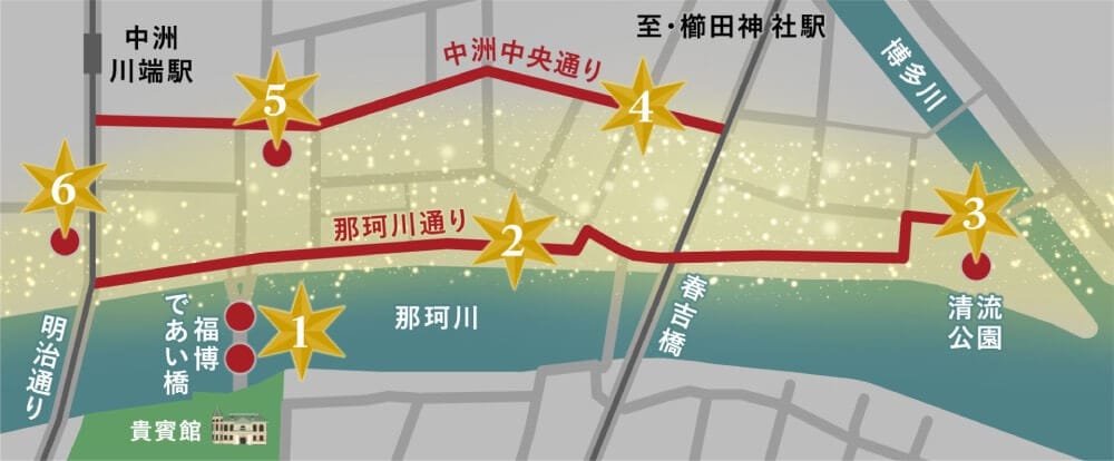 這次的聖誕點燈範圍也包含中州。各種聖誕裝飾讓福岡市的夜晚多了份浪漫。