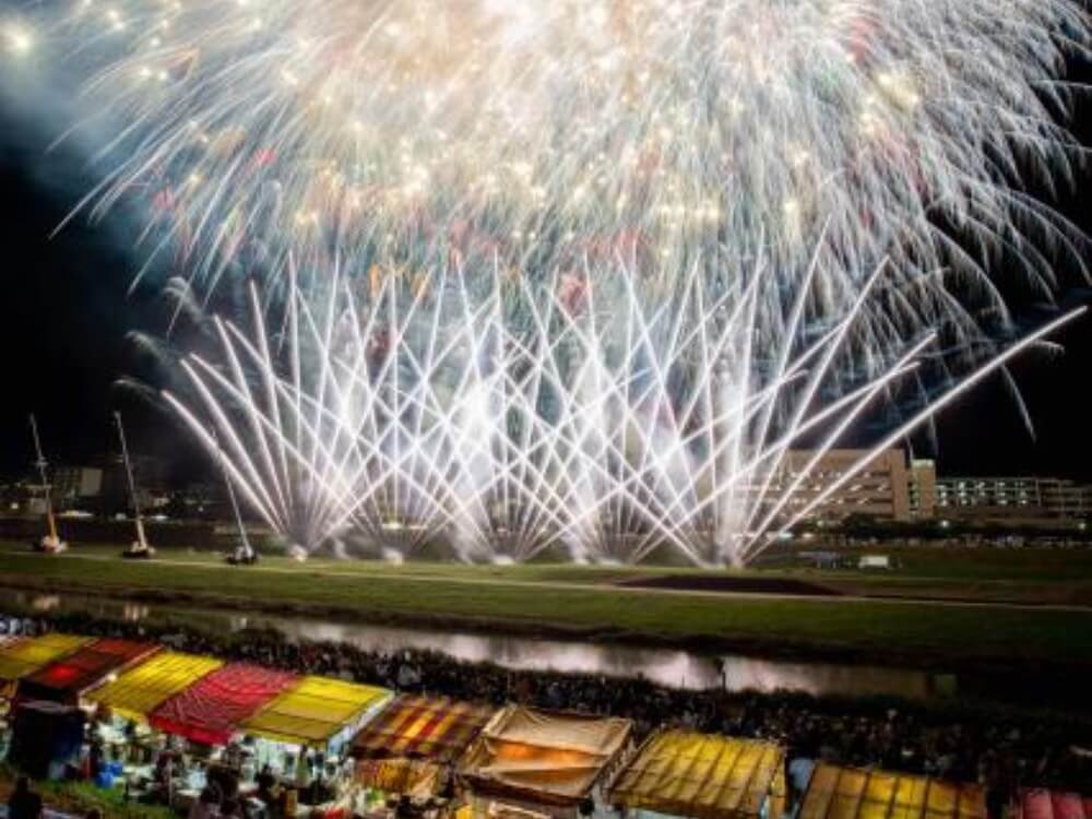 久留米市的花火大會起源於1650年,為慶祝水天宮落成舉行的慶典,至今已有超過360年的歷史。這場煙火大是西日本規模數一數二的大型活動,將施放約15,000發煙火。