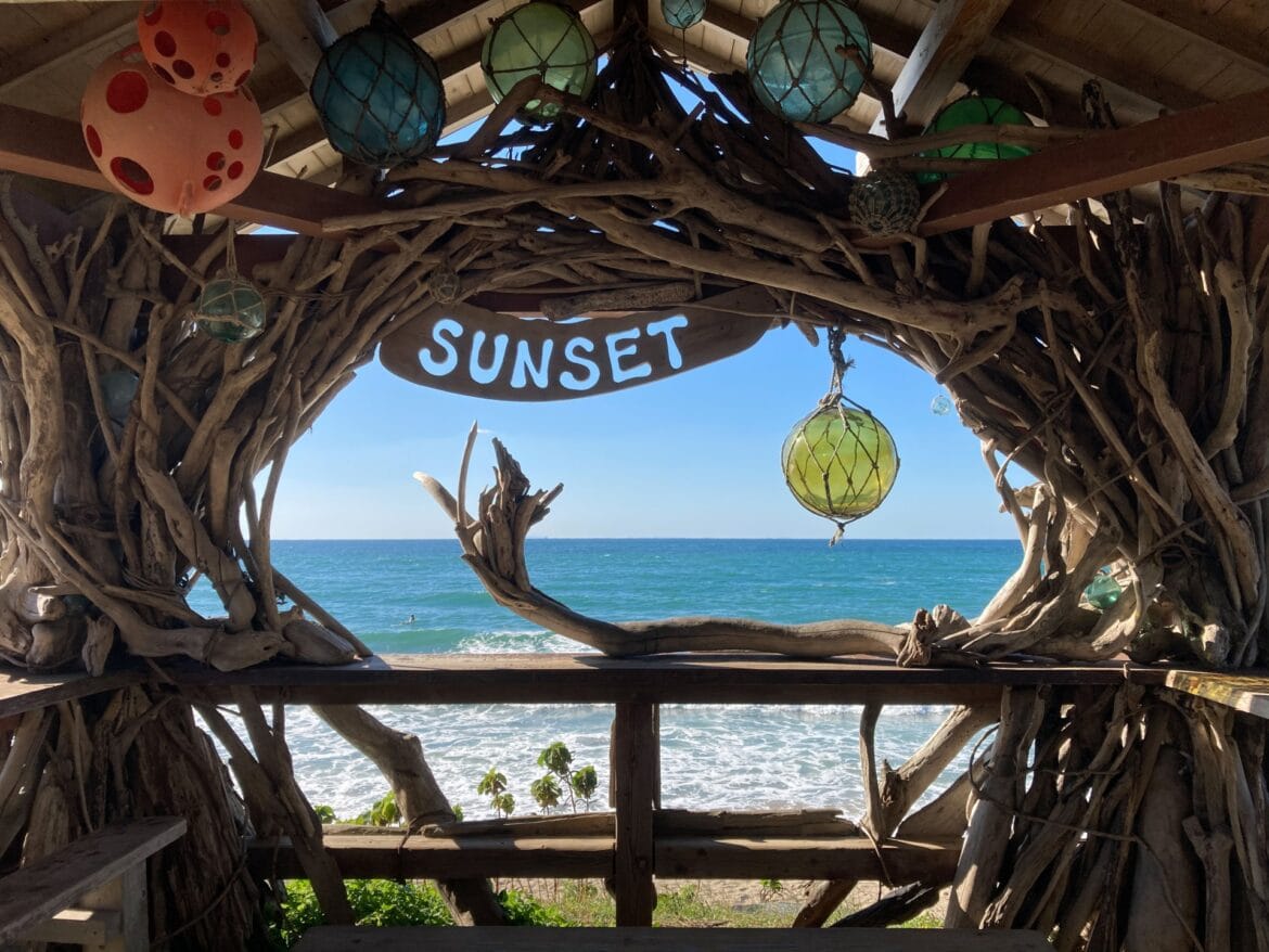 PALMBEACH的知名打卡點「天使之翼」,站中間拍照宛如長出翅膀。右圖則是人氣咖啡SUNSET的涼亭,以漂流木等自然素材裝飾而成。能欣賞如畫般的海景與藍天。