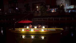 除了在特別設計的攝影棚中拍攝外,還能體驗福岡特色的和舟取景拍攝。穿上華美的花魁和裝,搭乘緩緩行駛的和舟,沿著水面移動,彷彿踏入江戶時代的物語世界。