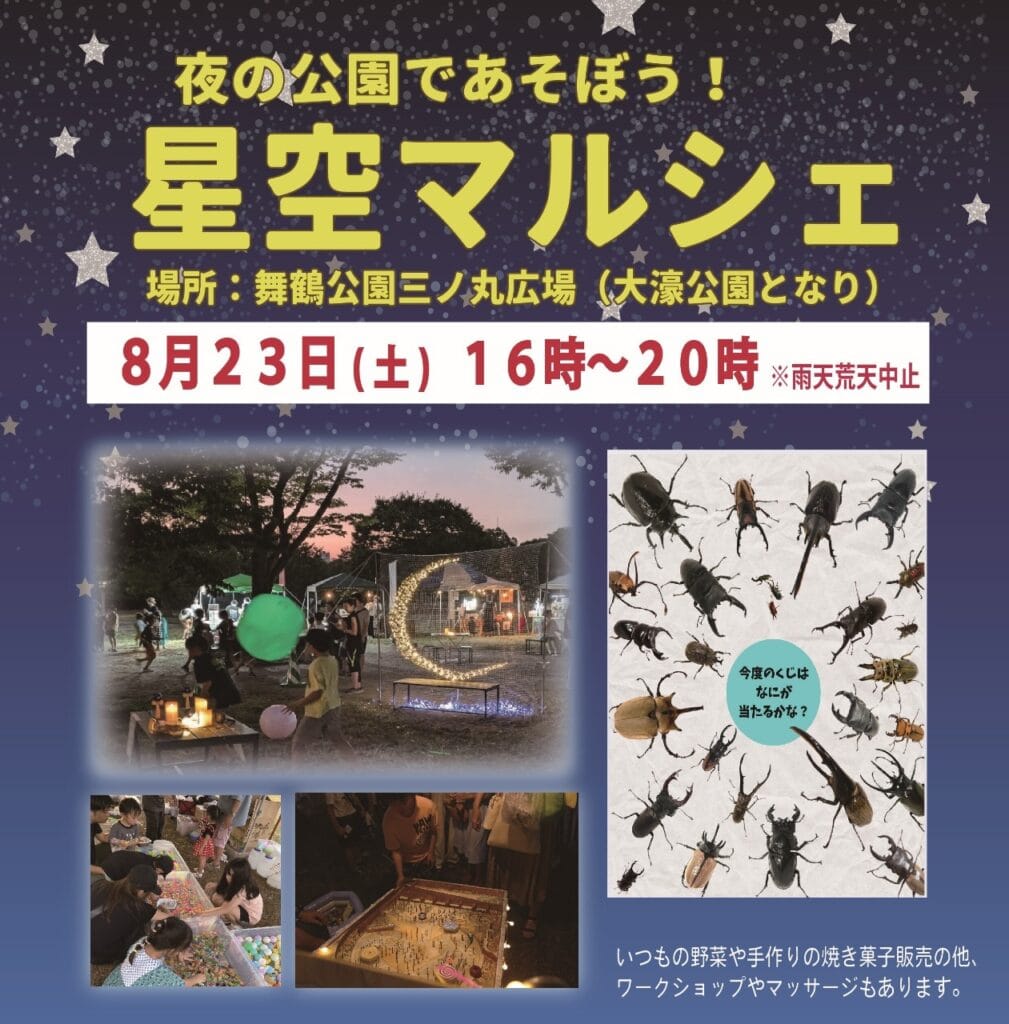 「星空マルシェ」是福岡舞鶴公園一個獨特的夜間市集活動,今年的「星空マルシェ」將於暑假的最後一個星期六(8月23日)舉行,大約有30家店鋪將會在此設攤,從新鮮蔬菜到手工點心、餐車美食,各式各樣的商品應有盡有。此外,還有適合小朋友參與的昆蟲抽籤、遊戲攤位,以及能感受祭典氛圍的各種體驗和工作坊,非常適合家庭到此享受最後的暑假時光~